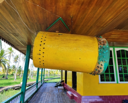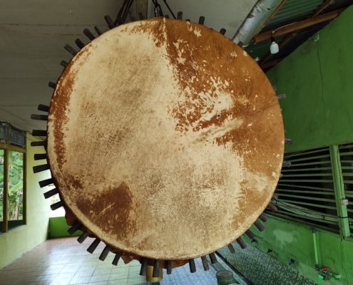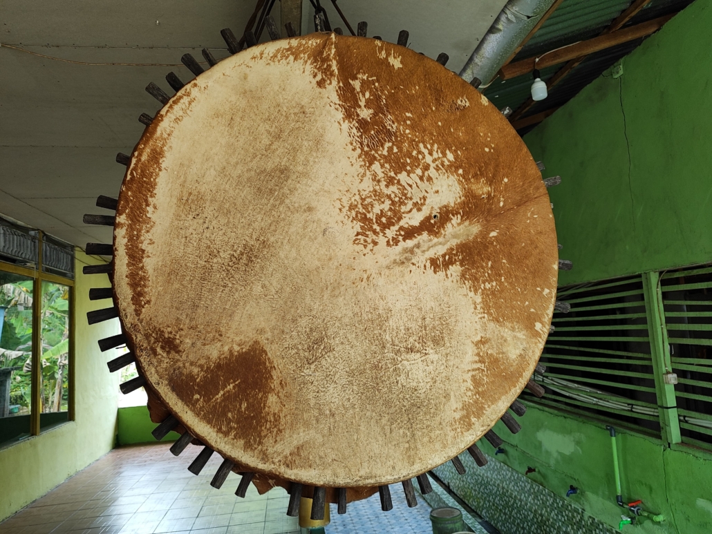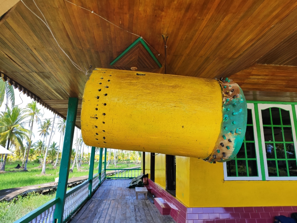 Terdapat pasak kayu yang berfungsi sebagai pengunci kulit pada kedua sisi beduk dengan jumlah masing-masing 68 buah. Ukuran pasak beduk beragam, ada yang memanjang ke dalam dan pendek. Beduk berwarna kuning dengan kulitnya berwarna hijau. Pada badan beduk, terdapat 3 buah lubang berbentuk persegi yang difungsikan sebagai lubang pengikat beduk yang dihubungkan dengan langit-langit masjid. Posisi Beduk menggantung pada sudut antara utara dan timur serambi masjid.