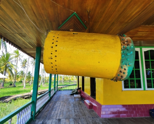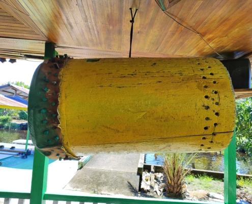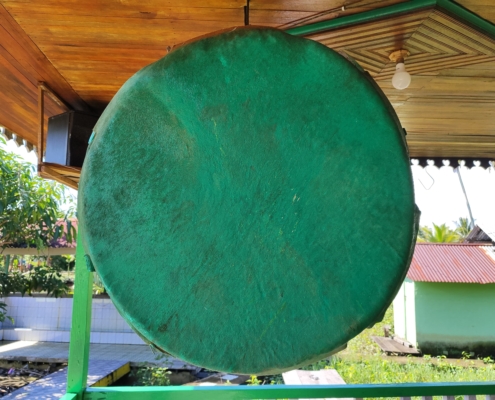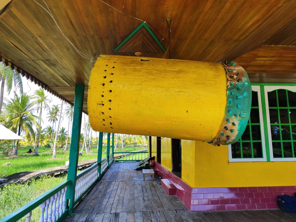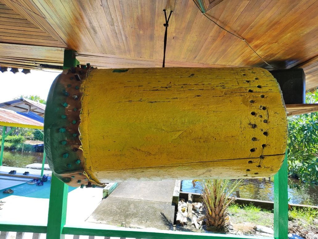Masjid Jami’atus Sholihin berada di Desa Tanjung Saleh yang pada saat merupakan bagian dari wilayah Kesultanan Kadriyah Pontianak Menurut informasi dari pengurus Masjid Jami’atus Sholihin yaitu Alm. Bunyamin dan Syarif Muhammad Alhinduan beduk ini diberikan oleh Sultan Syarif Muhammad Alkadrie kepada pengurus Masjid Jami’atus Sholihin dalam rentang tahun 1895 – 1944 M. Terdapat beberapa beduk sebagai hadiah yang disebarkan ke masjid-masjid yang saat itu berada di wilayah kekuasaan Kesultanan Kadriyah Pontianak diantaranya Masjid Jamiatul Muslimin di Desa Jeruju Besar, Masjid Jami’atus Sholihin di Desa Tanjung Saleh, dan Masjid Jami’ Sultan Syarif Abdurahman sendiri yang berada di lingkungan Keraton Kadriyah.