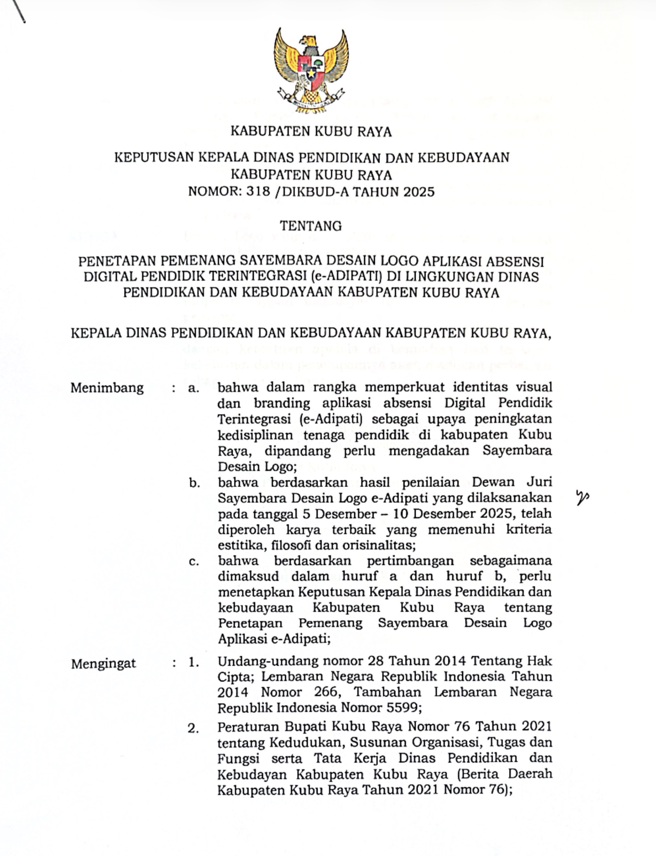 Dinas Pendidikan dan Kebudayaan Kabupaten Kubu Raya dengan bangga mengumumkan hasil penetapan pemenang Sayembara Desain Logo Aplikasi Absensi Digital Pendidik Terintegrasi (e-ADIPATI).