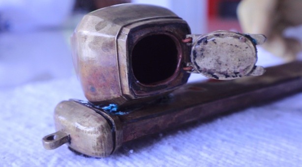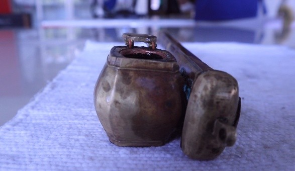 Dari sisi teknologi, qalamdan ini dibuat dengan teknik pengerjaan logam tradisional, kemungkinan melalui proses pengecoran untuk membentuk badan utama tabung dan wadah tinta, kemudian dilanjutkan dengan pembentukan manual dan penyambungan antarbagian. Pemasangan engsel pada penutup wadah tinta menunjukkan penguasaan teknik mekanis sederhana namun presisi, yang umumnya ditemukan pada benda logam praindustri atau awal masa industri. Permukaan benda tampak dihaluskan secara manual dan tidak menunjukkan jejak produksi mesin modern.